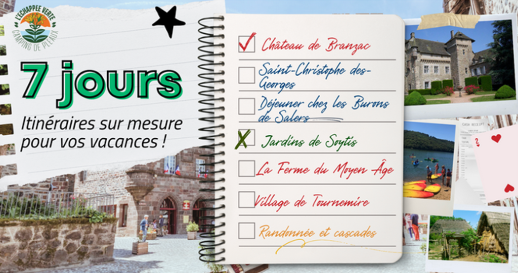 | Matin | Pot d’accueil | Visite du Viaduc Rocher Noir | Activité avec les enfants 2h | Randonnée autour de Pleaux 3h | Visite guidé de Salers, activité payant | |